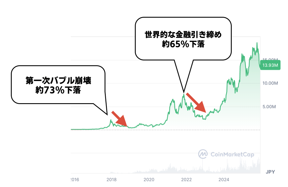 • 2018年:仮想通貨バブル崩壊(約73%下落)