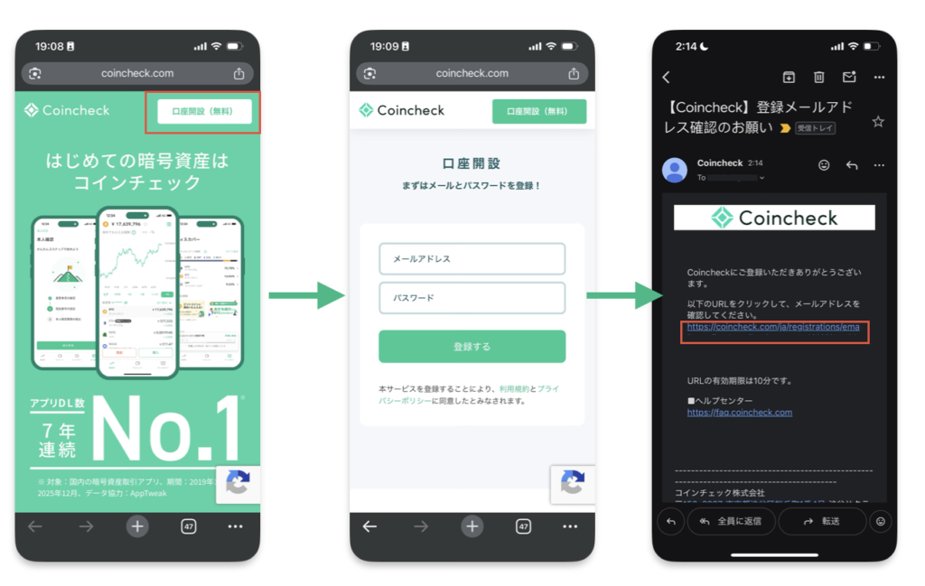ここからは、実際にコインチェックで口座開設して仮想通貨を購入するまでの流れを解説します。