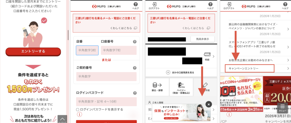 - または三菱UFJダイレクトのWebログインページから直接ログインしてエントリーする